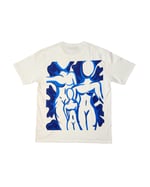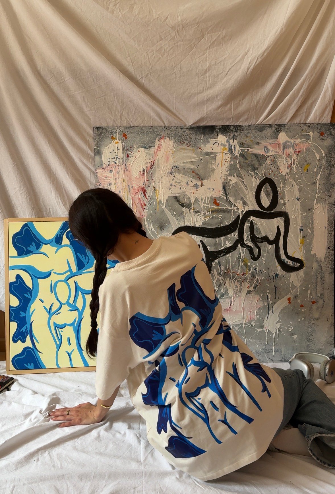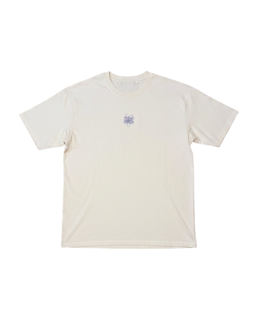 Camiseta beige oversize con logo frontal y obra original ''Siempre tú'' en espalda.