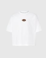 Camiseta blanca oversize corte cuadrado con logo marrón y blando frontal y obra original ''A Fairy Tale'' en espalda.