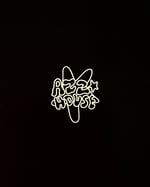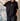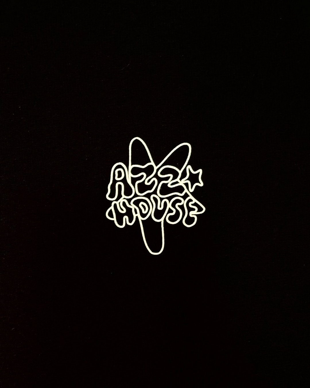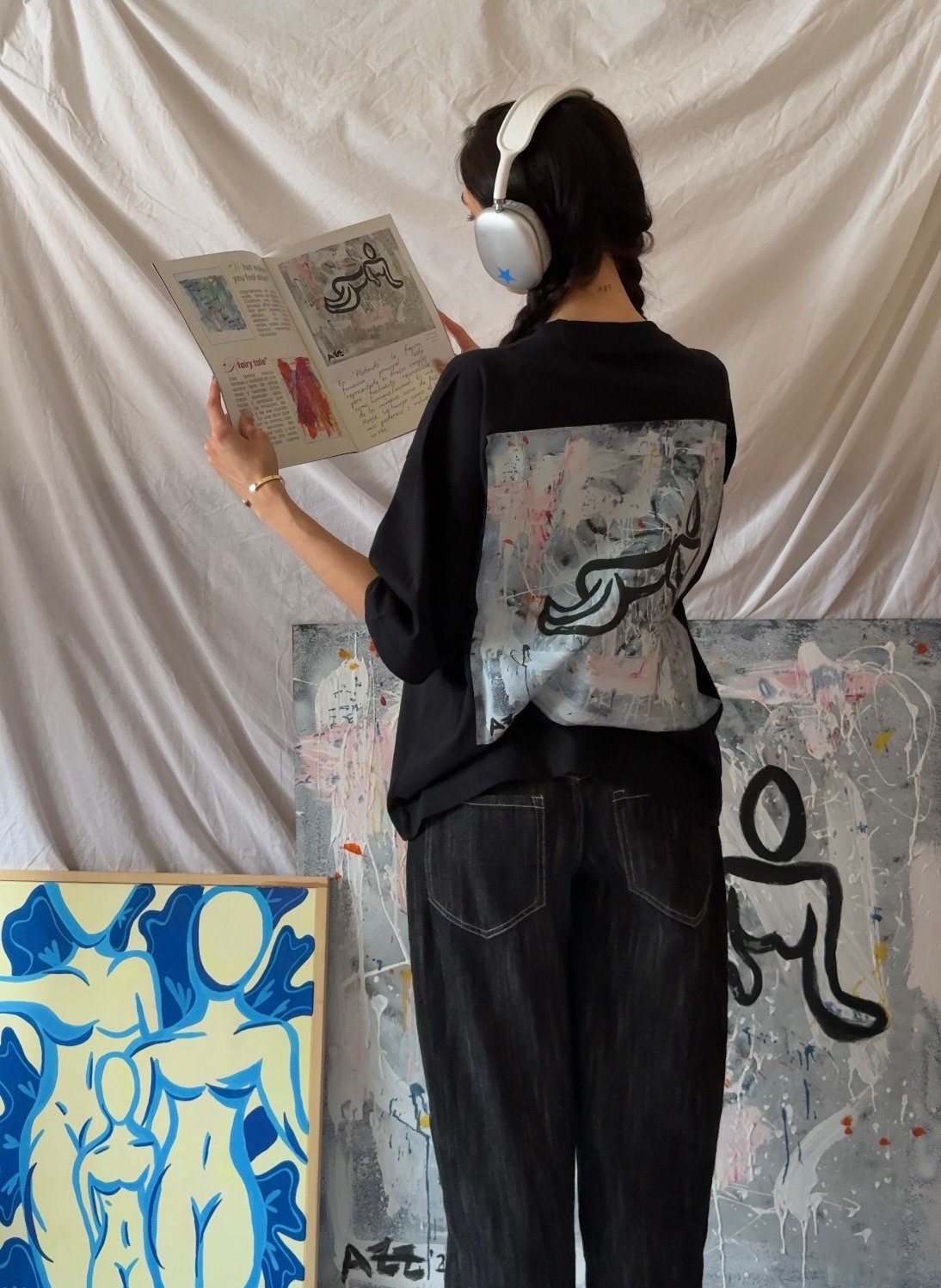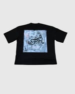 Camiseta negra oversize corte cuadrado con logo frontal blanco y obra original ''Flotando'' en espalda.