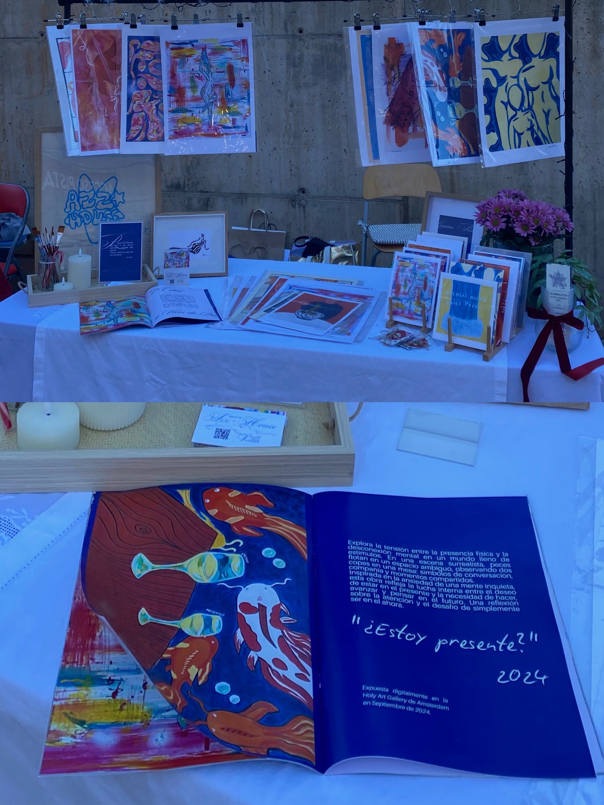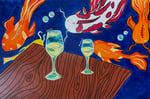 Esta obra, explora la tensión entre la presencia física y la desconexión mental en un mundo lleno de estímulos. En una escena surrealista, peces flotan en un espacio ambiguo, observando dos copas en una mesa: símbolos de conversación, compañía y momentos compartidos.